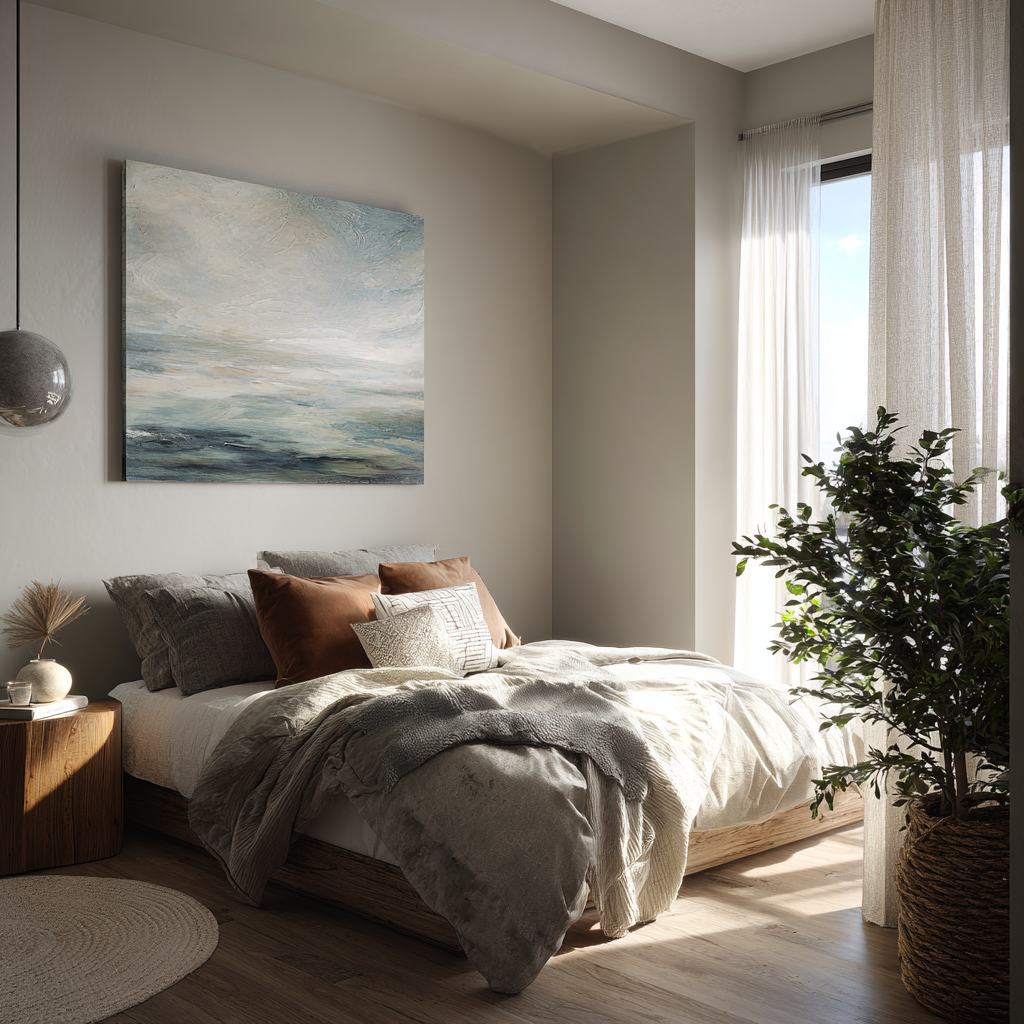 Paintings bring atmosphere; sculpture brings gravity; textiles bring warmth. Don’t rely on one medium to carry the entire emotional load.