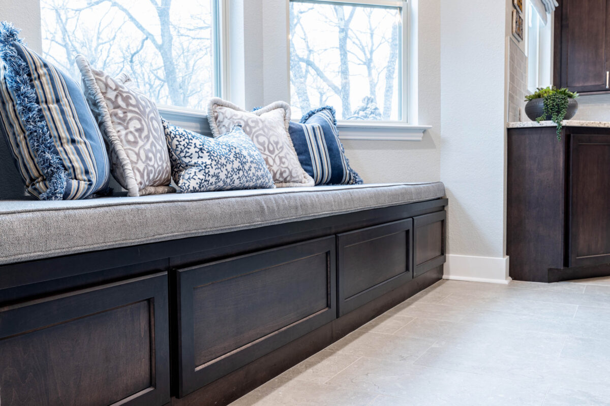 A built-in banquette inserts additional seating along a wall or into a corner. It’s often upholstered and paired with a pedestal or rectangular table. This creates a cozy nook and can make a breakfast area feel extremely charming!!