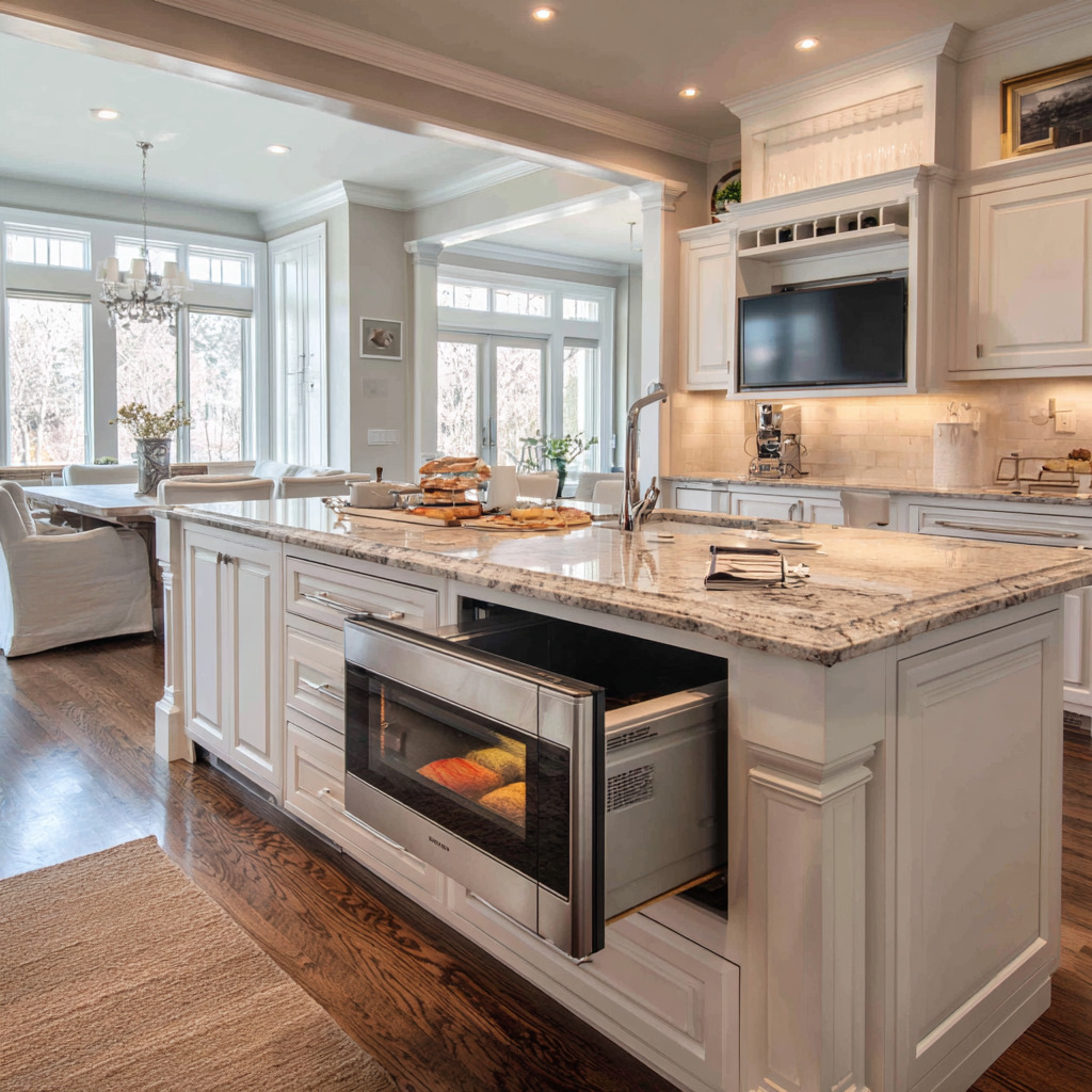 In concept drawings, this design feature solves the “where do we put the microwave?” dilemma, and it does that elegantly. A microwave drawer frees up wall space too, and keeps your counter uncluttered.