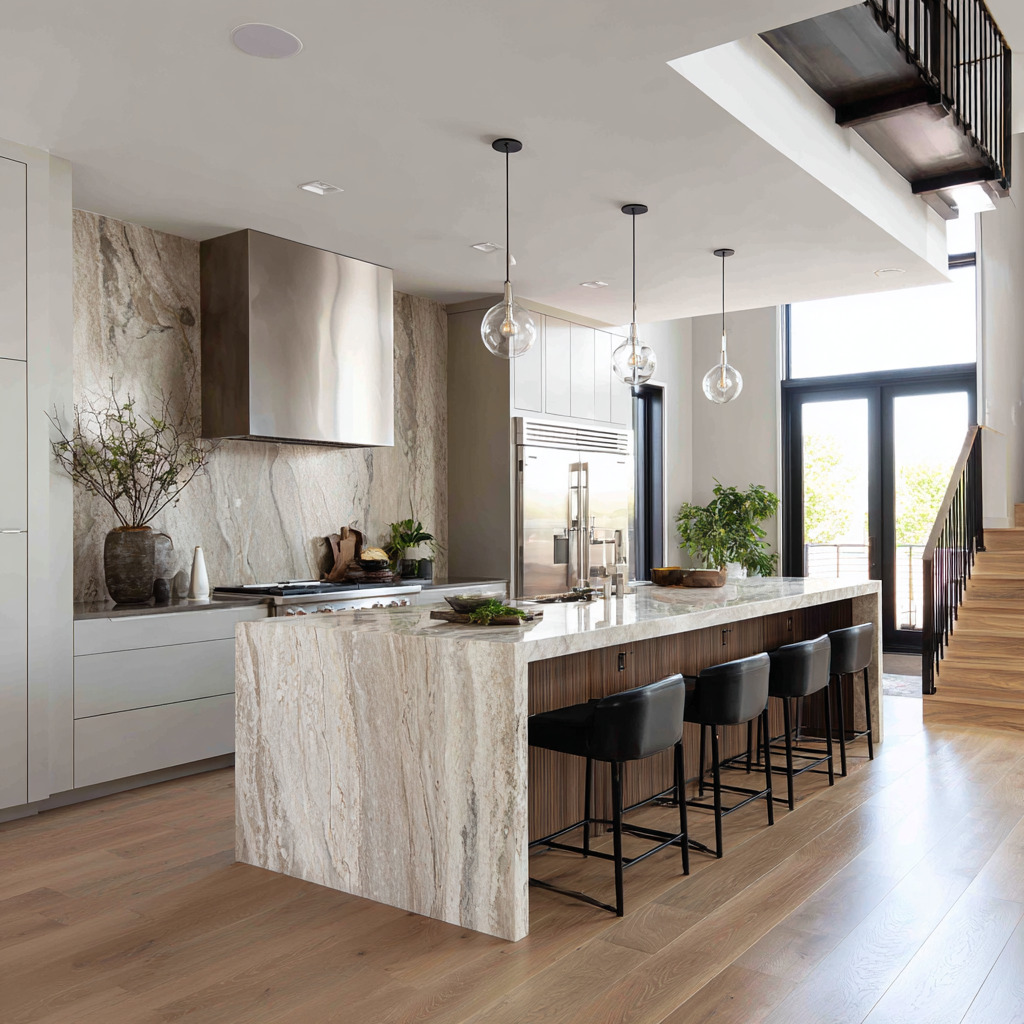 A large waterfall island is a generous slab of stone that extends to the floor on both ends, creating a sort of sculptural centerpiece in the middle of your kitchen. It becomes the visual anchor of the space, and it’s made up of equal parts prep surface and gathering zone.